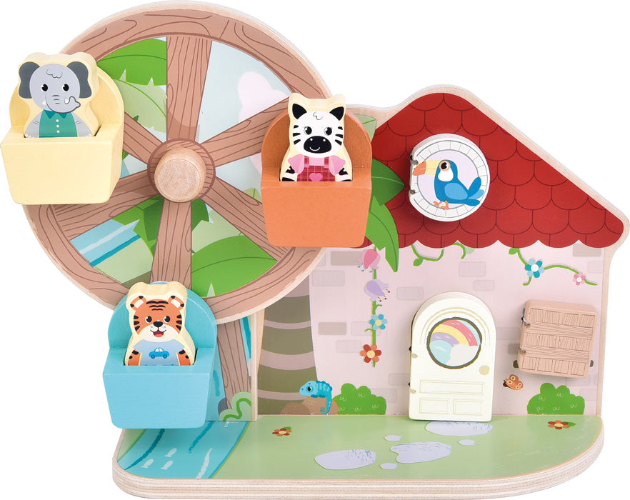 Gira, stupisciti e scopri il mondo con questa affascinante ruota panoramica! Realizzata in legno certificato FSC® 100%, è il compagno perfetto per sviluppare la motricità fine e la coordinazione occhio-mano. Tre simpatici personaggi in legno – tigre, zebra ed elefante – prendono posto sulle cabine, mentre dietro le tre alette colorate della casetta si nascondono gli stessi animali in attesa di essere scoperti. La pratica manovella sul retro rende semplicissimo far girare la ruota, mentre i piccoli allenano la presa mirata e il posizionamento preciso. Un gioco tridimensionale che stimola fantasia e creatività con colori allegri e dettagli adorabili. Ogni movimento allena la coordinazione e la destrezza manuale in un ambiente vibrante e affascinante. Perfetto per stimolare curiosità e creatività, questo giocattolo combina il divertimento dell'esplorazione con lo sviluppo delle abilità motorie, il tutto immerso in una giungla dai colori vivaci che cattura l'immaginazione.