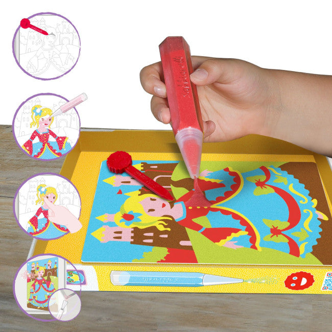 Pensato per la fascia d'età 5-12 anni, il kit contiene tutto il necessario per un'esperienza di pittura con la sabbia, un tema principesse facile e divertente. Non servono forbici o colla: rimuovendo la carta dai fogli rimane la superficie adesiva da colorare con le sabbie Sabbiarelli®. Grazie alle speciali penne Sabbiarelli, colorare con la sabbia è un'azione alla portata di tutti: i piccoli artisti possono liberare la loro creatività nella colorazione, seguendo l'esempio colore o scegliendo nuove combinazioni o ancora creando nuovi sfumatore di colore mischiando tra loro le sabbie. E quando si son sabbiarellati tutti i disegni, si possono usare le schede per giocare con le principesse o usarle come quadretti da appendere nella propria cameretta. La sabbia dei Sabbiarelli proviene infatti dal marmo bianco di Carrara, per questo è così scintillante!